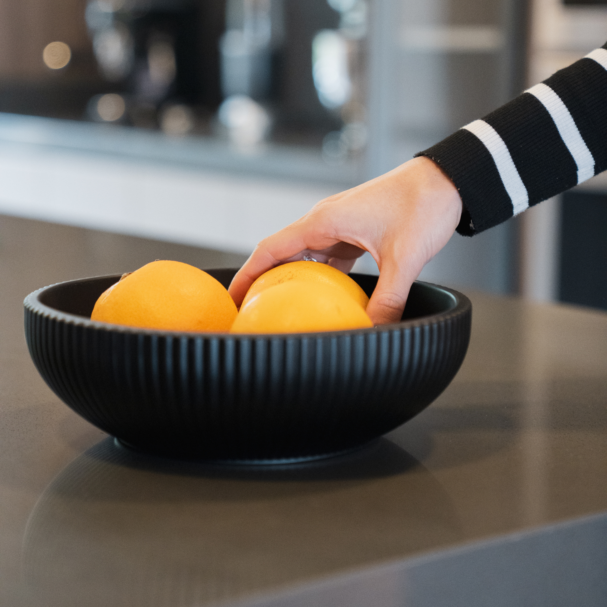 Cuenco redondo de concreto en color blanco y negro mate. Una pieza de gran presencia y diseño elegante con un delicado relieve de líneas verticales, que añade textura y estilo a cualquier espacio. Puedes usarlo como prefieras, con frutas, decoración o pasantes.