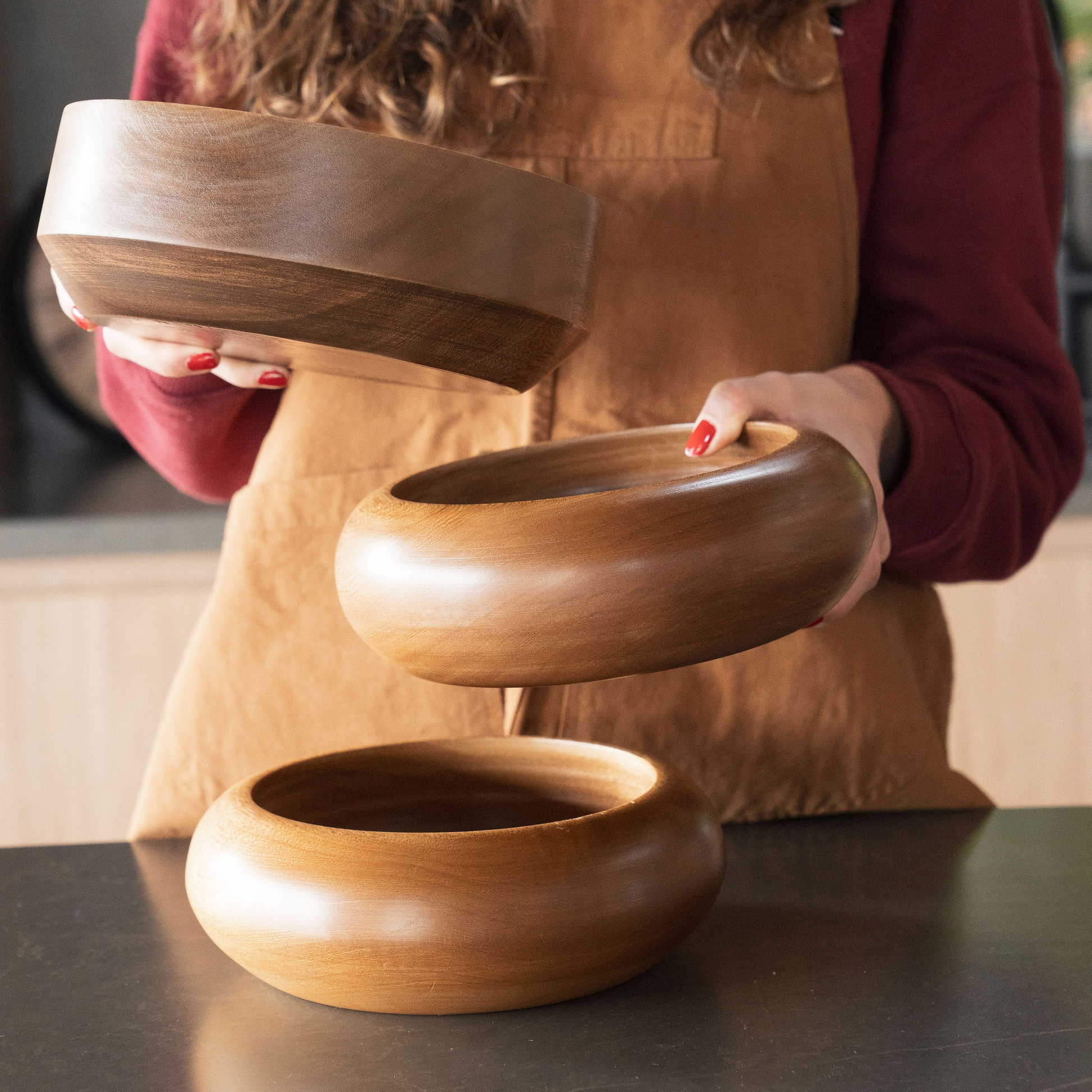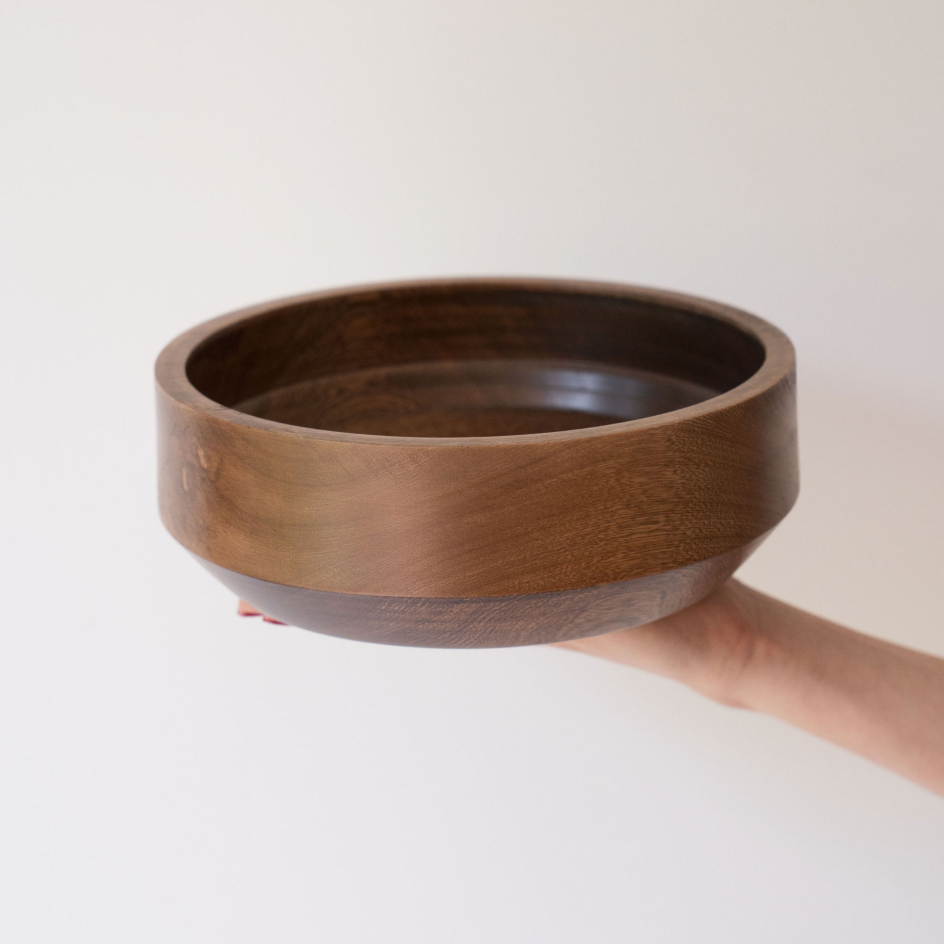 Recipiente tallado en madera de roble con acabado oscuro y elegante. Su diseño con un corte en la parte baja la convierte en una pieza decorativa protagonista en cualquier espacio. Ideal para poner alimentos como nueces, frutas, pasantes o decoración en mesa de centro.