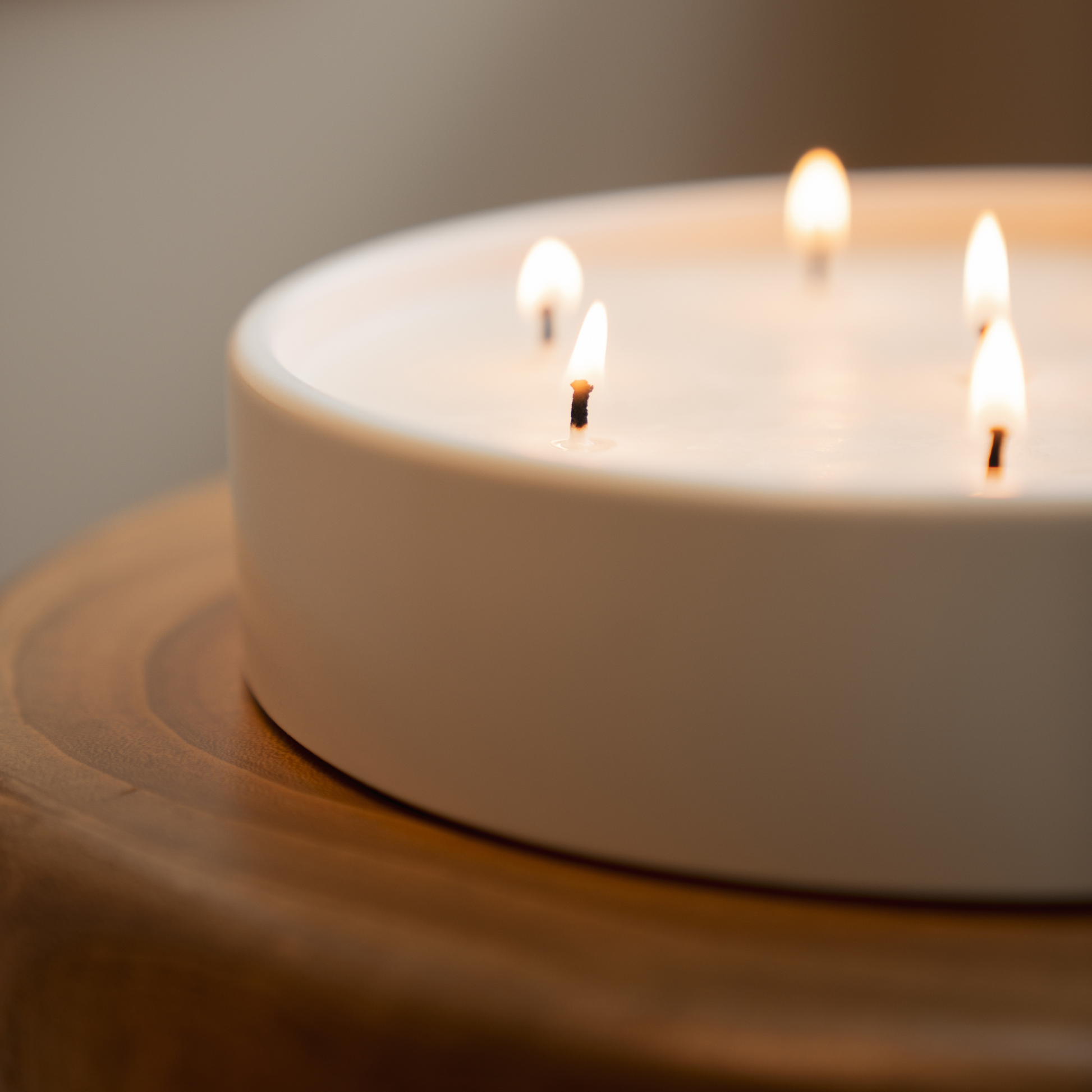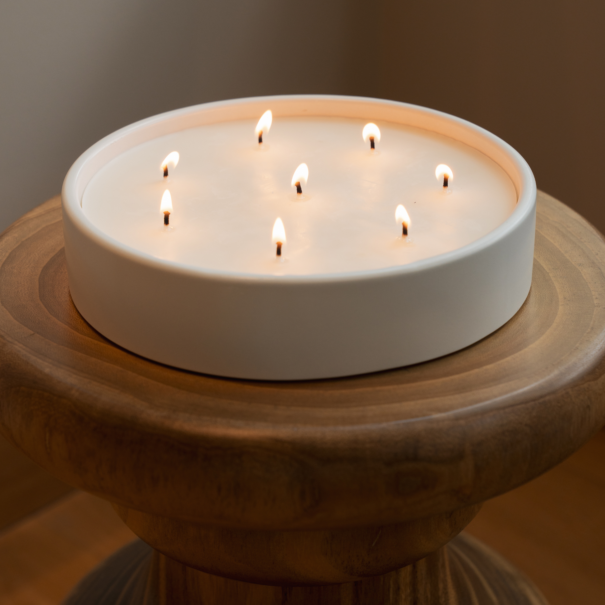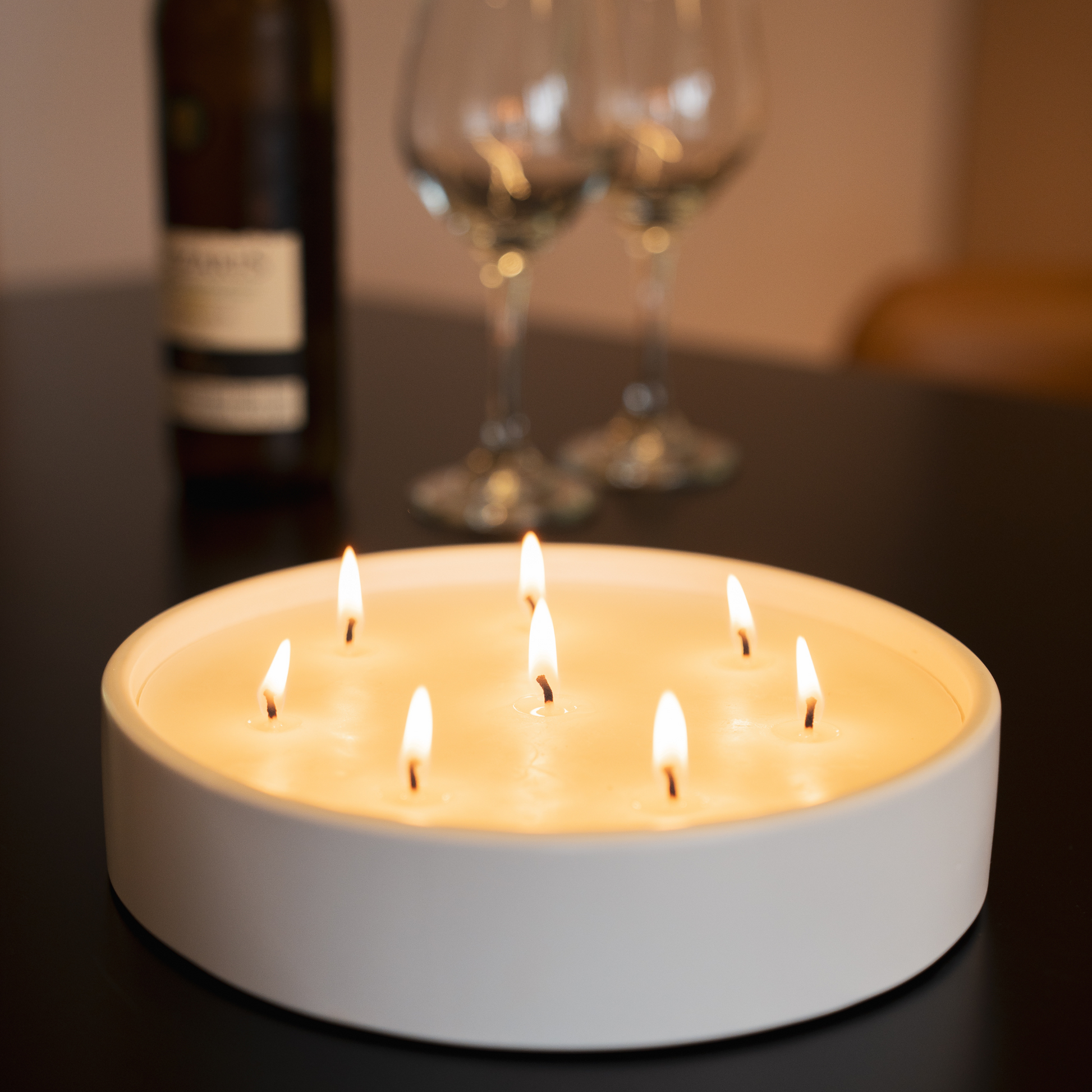 Vela en contenedor redondo de concreto liso color blanco. Su diseño ancho y de altura baja aporta un estilo único y sofisticado. Hecha con cera de palma natural, puedes elegir tu aroma preferido.