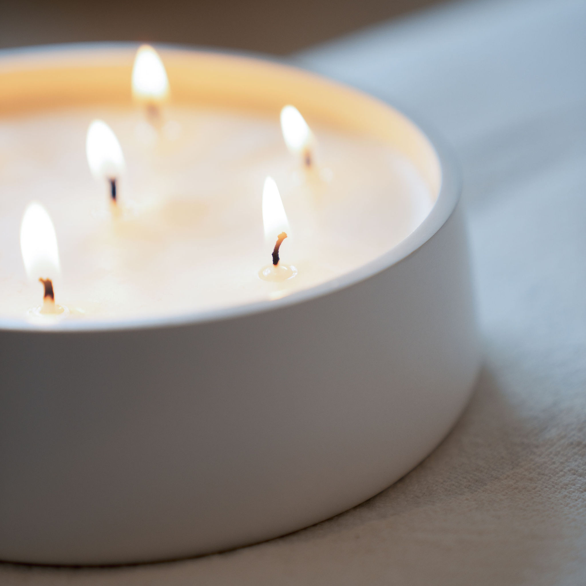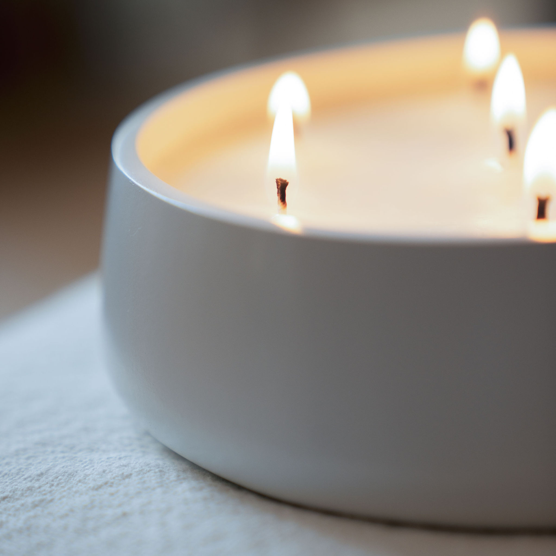 Vela en contenedor redondo de concreto color blanco. Minimalista y elegante, perfecta para espacios pequeños o como regalo. Hecha con cera de palma natural, puedes elegir tu aroma preferido.
