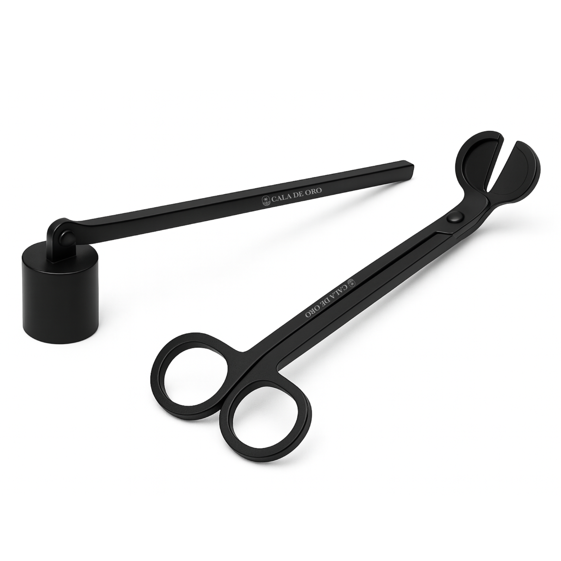 El set incluye apagavelas y corta pabilos en acero inoxidable, diseñados para cuidar tus velas y prolongar su vida útil con elegancia. Acabado metálico mate, resistente y sofisticado, ideal para acompañar cualquier vela Cala de Oro.
