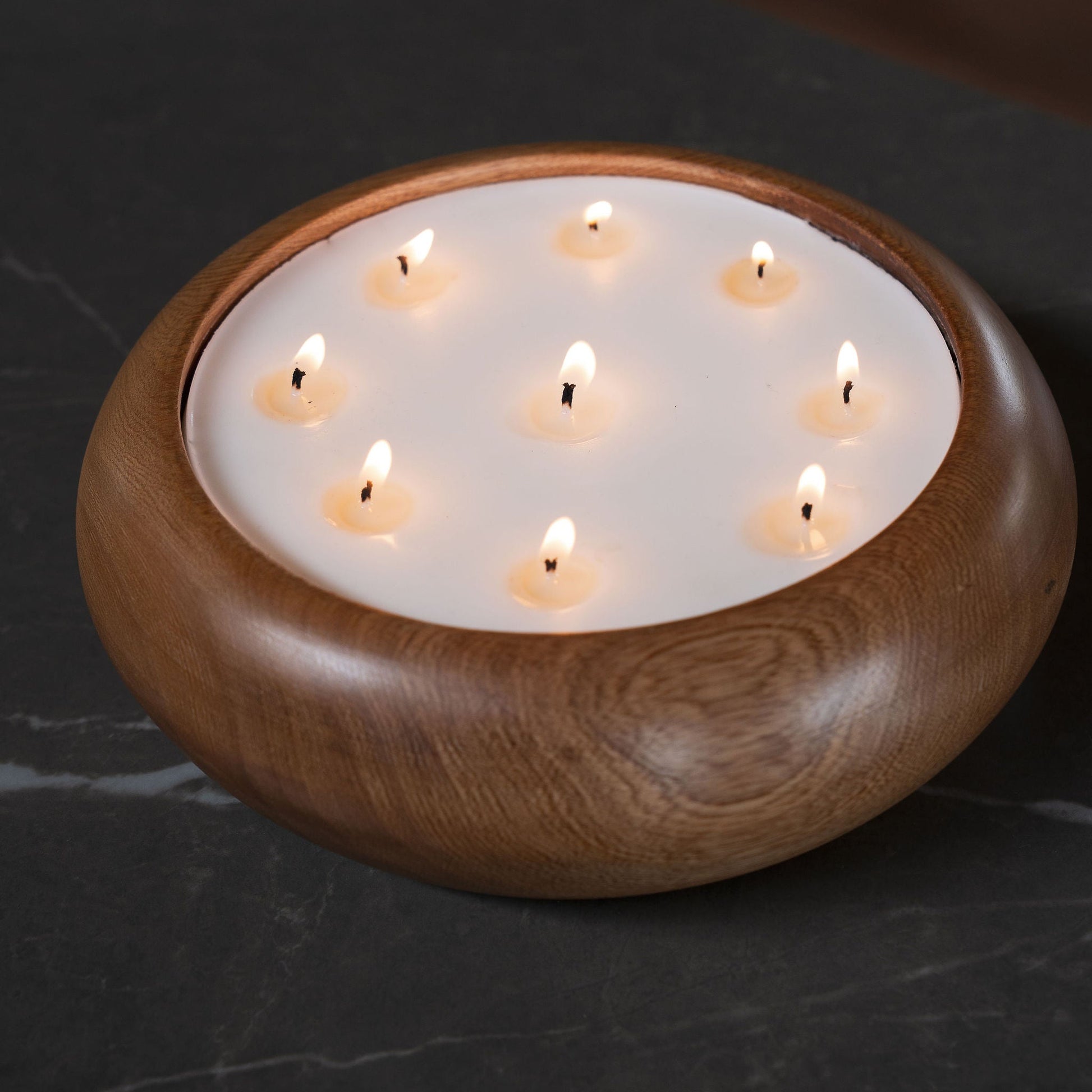 Vela en recipiente redondo y con curvas tallado en madera de roble natural, con acabado suave y vetas visibles que hacen de cada pieza una creación única.