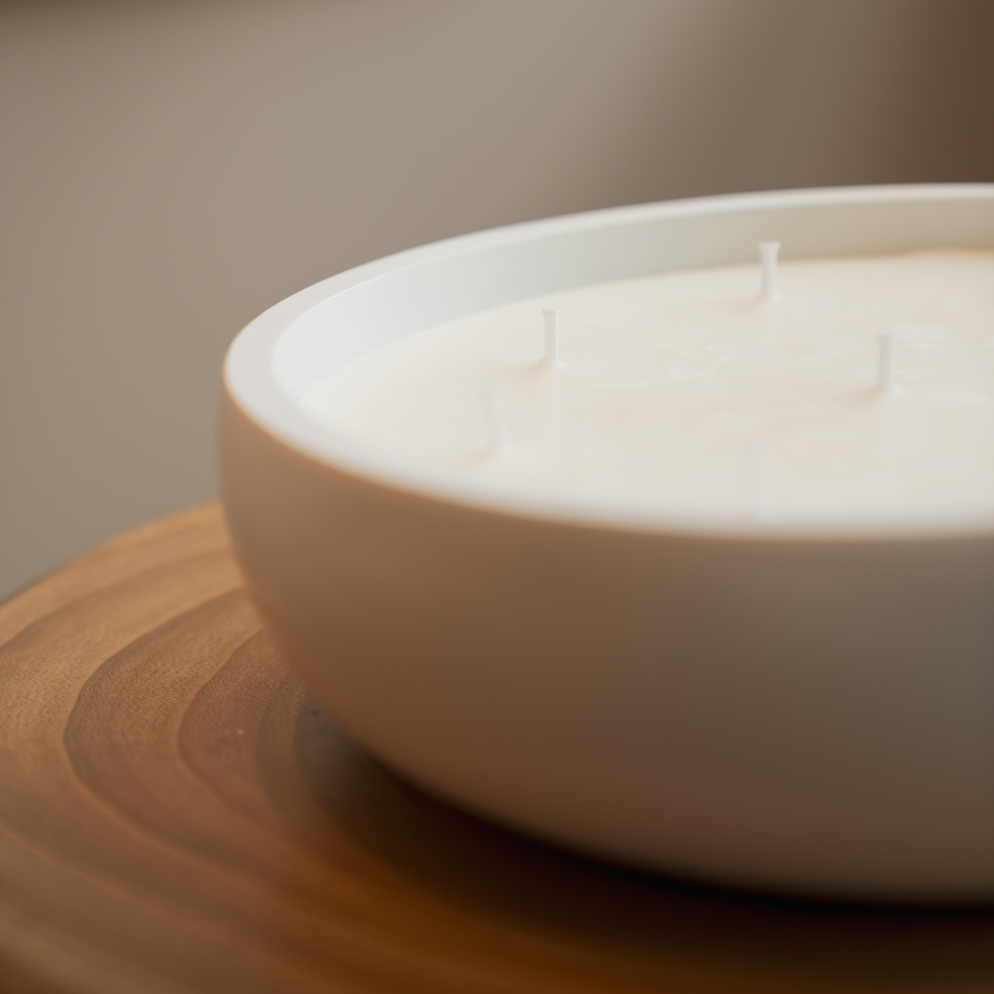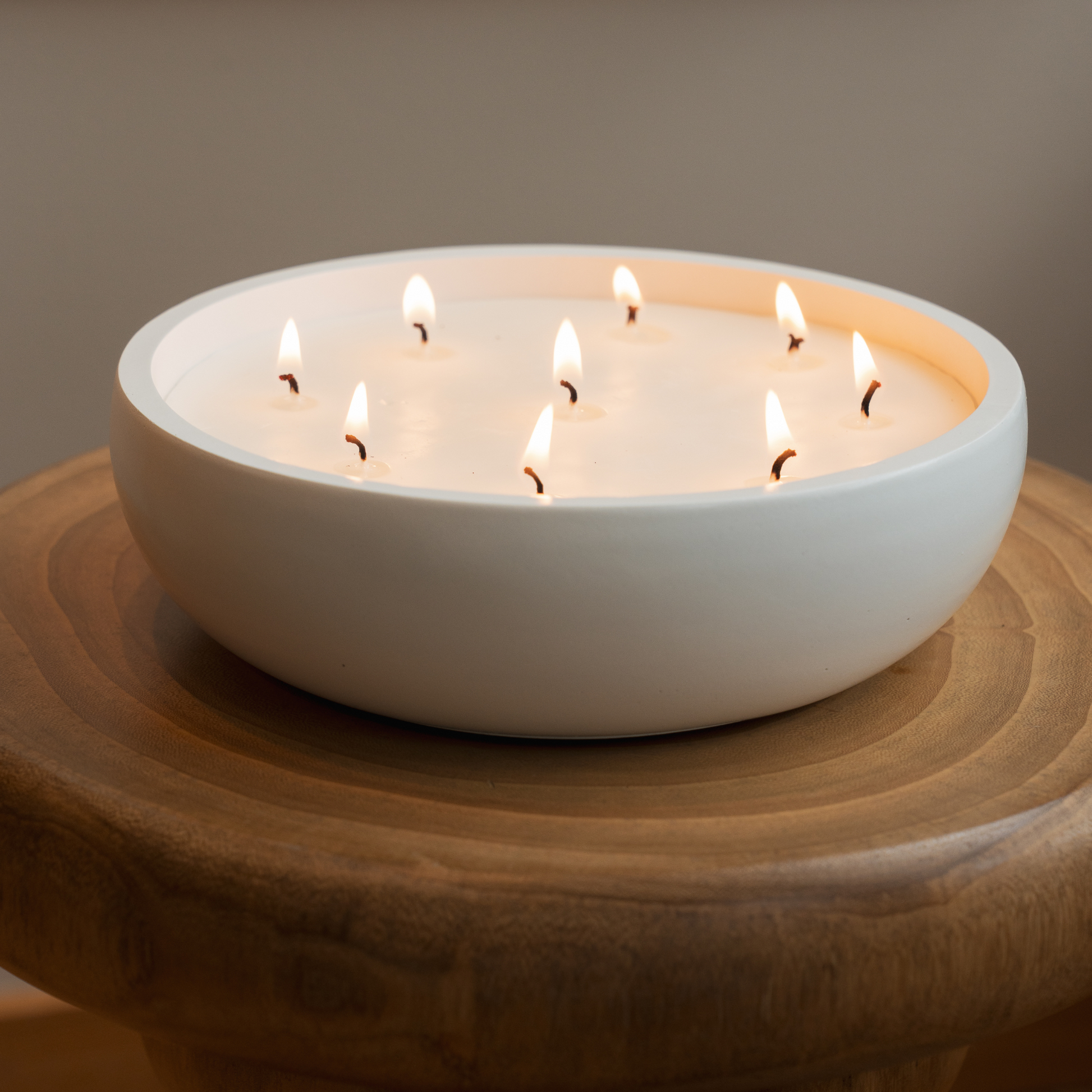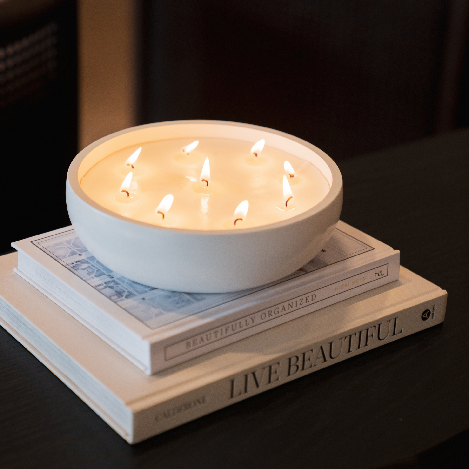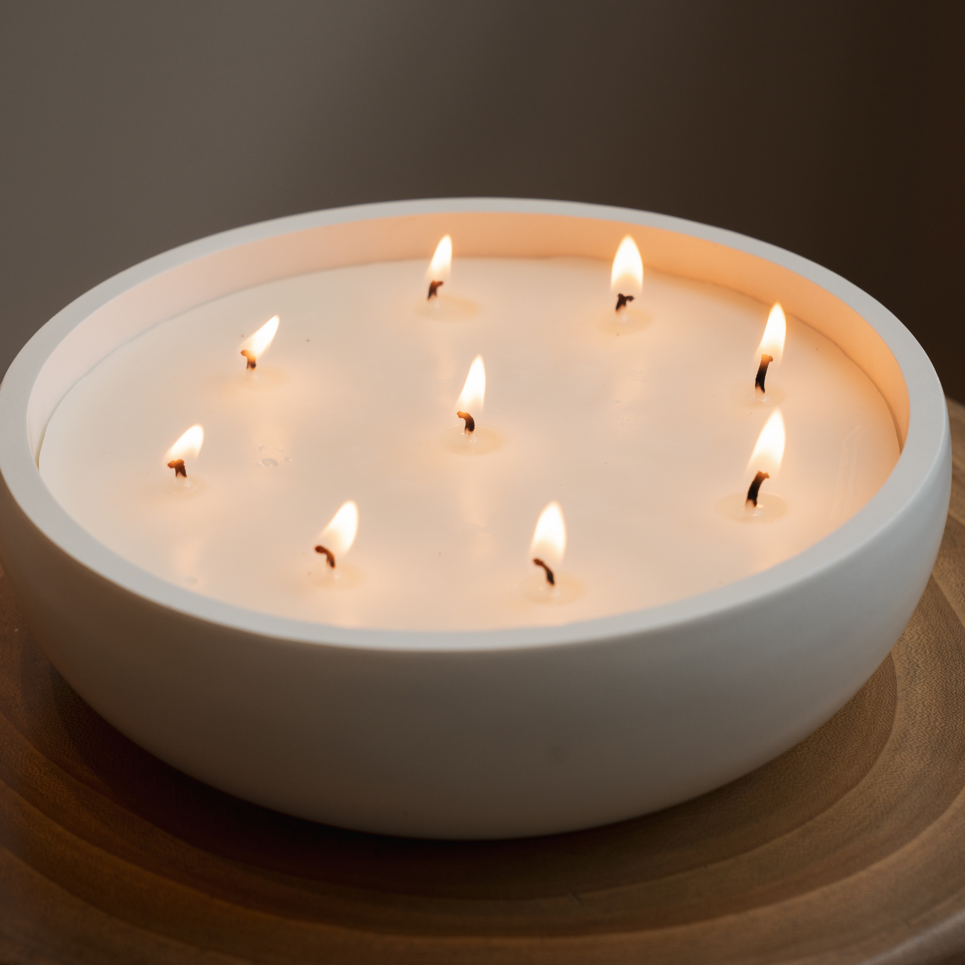 Vela en contenedor redondo de concreto liso color blanco. Diseño amplio en la parte superior y más angosto en la parte inferior, perfecto para ubicar en mesas de tamaño mediano/grandes. Hecha con cera de palma natural, puedes elegir tu aroma preferido.